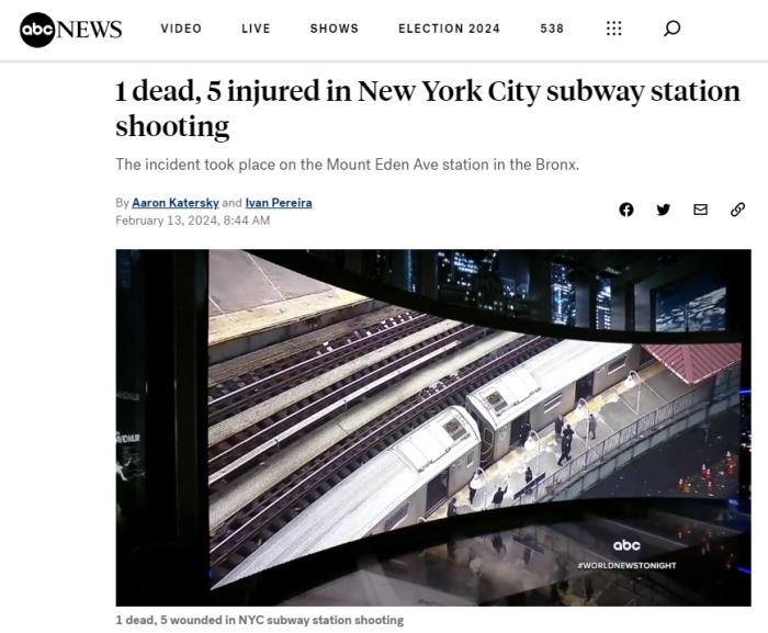 中新網(wǎng)2月13日電 據(jù)美國廣播公司(ABC)報道,當?shù)貢r間12日下午,美國紐約布朗克斯一個地鐵站發(fā)生槍擊事件,造成1人死亡,5人受傷。