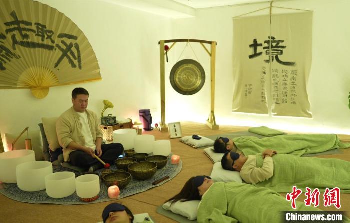 待大家緩緩躺下,蓋好被子、戴好眼罩后,魏慶宏用音錘緩緩在缽體上摩擦、敲擊。隨著陣陣沉穩(wěn)悠長的“嗡嗡”聲,顧客漸漸進入睡眠狀態(tài)。他說,來體驗的年輕顧客居多。