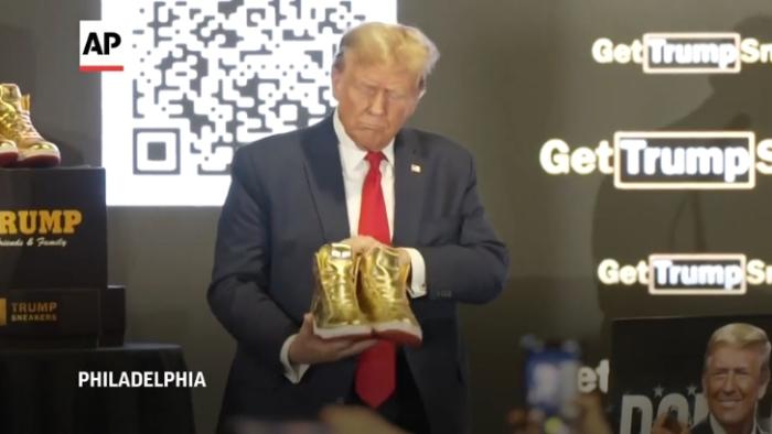 據(jù)報(bào)道,特朗普當(dāng)天在費(fèi)城會(huì)議中心舉行的球鞋展會(huì)上,手持一雙金色的“特朗普”牌球鞋進(jìn)行展示。