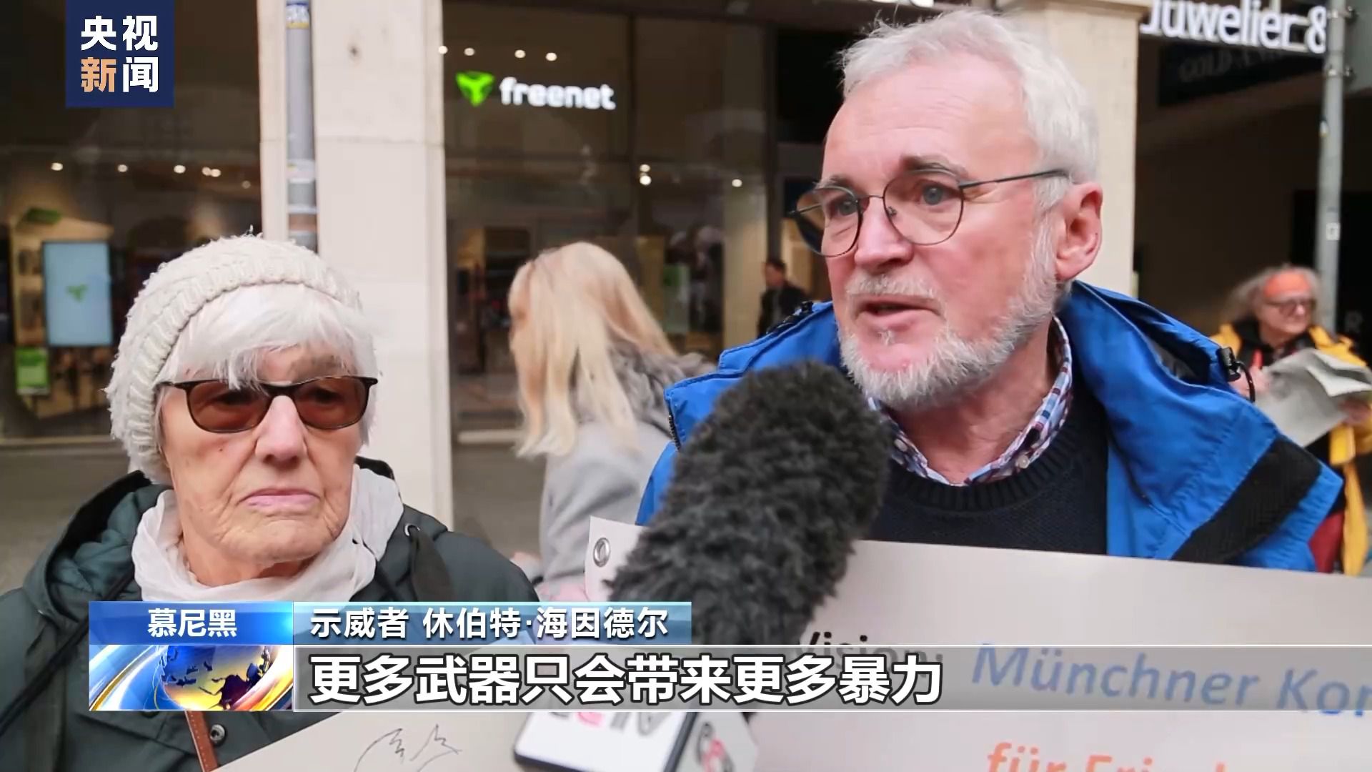 示威者 休伯特·海因德爾:更多武器只會(huì)帶來更多暴力,以暴制暴,我們希望通過抗議呼吁慕安會(huì)的(西方國(guó)家)與會(huì)人士擺脫軍事思維和手段,用和平思維來解決沖突。
