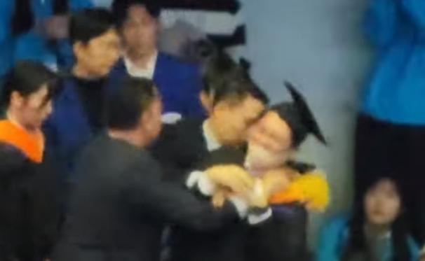 據(jù)在場(chǎng)人員透露,在尹錫悅致辭時(shí),一名身穿學(xué)士服的男生面向尹錫悅所站立的講臺(tái)高喊。之后,總統(tǒng)警衛(wèi)人員捂住他的嘴巴,并把他強(qiáng)行抬出會(huì)場(chǎng)。