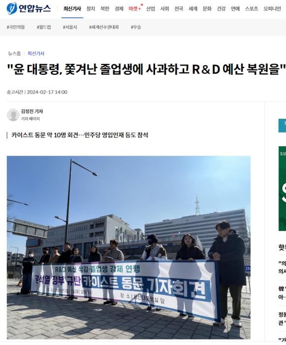 17日,韓國(guó)科學(xué)技術(shù)研究院的校友在龍山總統(tǒng)府前舉行記者會(huì),他們表示:“尹錫悅總統(tǒng)毫不留情地堵住畢業(yè)生的嘴,并將其趕了出去,對(duì)此我們感到非常憤怒?!彼麄円笠a悅道歉,并恢復(fù)削減的研究與開(kāi)發(fā)預(yù)算。