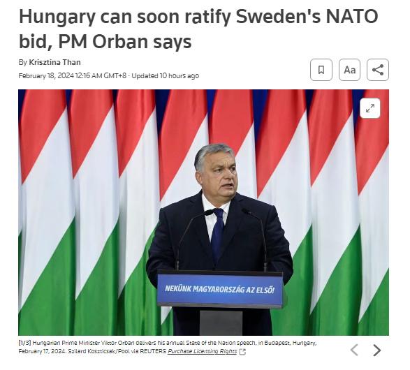 據(jù)報(bào)道,歐爾班表示:“這是個(gè)好消息,我們與瑞典的爭(zhēng)端很快就會(huì)得到解決?!?/p>