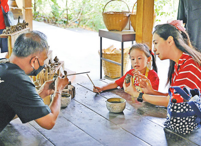 在曼谷桑普蘭濱江園有機(jī)農(nóng)場(chǎng)內(nèi),游客體驗(yàn)泰國(guó)傳統(tǒng)泥塑手工藝。