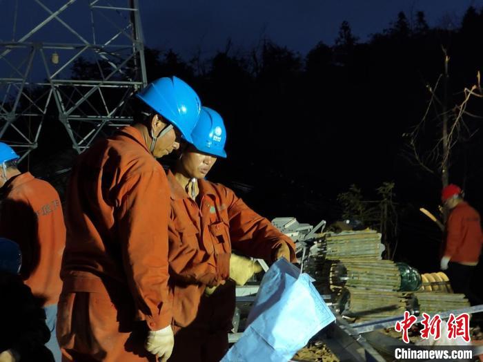 2月8日,國網(wǎng)浙江電力援湘搶險隊員前往平江縣開展搶修作業(yè),扛運搶修物資?!±盥勎?攝