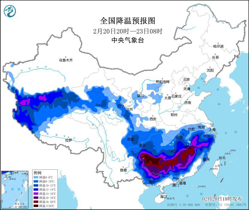中新網(wǎng)2月20日電 據(jù)中央氣象臺網(wǎng)站消息,中央氣象臺2月20日18時繼續(xù)發(fā)布寒潮橙色預(yù)警:受寒潮影響,預(yù)計,2月20日20時至2月23日,我國南方大部地區(qū)將出現(xiàn)降溫,日平均或最低氣溫普遍下降8~12℃,西南地區(qū)東南部、江南大部、華南中北部等地氣溫下降12~18℃,其中,貴州東南部、湖南西南部、廣西北部等地的部分地區(qū)累計降溫幅度可達(dá)20℃以上。2月23日前后,最低溫度0℃線將南壓到蘇皖南部至湖南南部、貴州南部一帶。