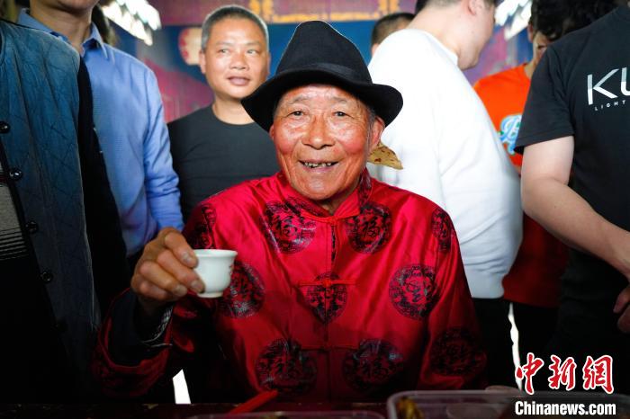 只見(jiàn)“酒醉公”身著紅色唐裝,頭戴禮帽,右手舉著一只面棰,用紅紙包著,寫(xiě)有“早生貴子”4個(gè)字。他逐一“打”前一年剛結(jié)婚的“新郎官”,從他們的左肩上輕輕滾打而下,再?gòu)南聺L打上右肩,邊滾打,邊講些祝愿他們夫婦新婚添丁、幸福美滿的吉祥話。
