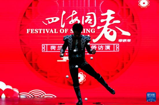 2月24日,演員在荷蘭海牙舉行的“四海同春”慰僑訪演活動(dòng)上表演雜技。新華社記者 孟鼎博 攝