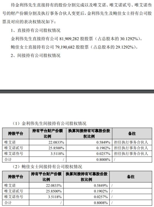 公告顯示,金利偉和鮑佳持有的唯艾諾、唯艾諾貳號(hào)、唯艾諾叁號(hào)三家合伙企業(yè)的財(cái)產(chǎn)份額由雙方均等分割,各占一半。唯艾諾貳號(hào)、唯艾諾叁號(hào)的執(zhí)行事務(wù)合伙人將變更為金利偉。變更后,三家合伙企業(yè)的執(zhí)行事務(wù)合伙人均為金利偉。