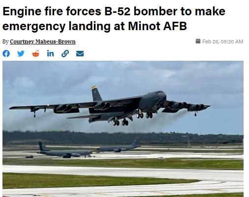 據(jù)報道,當天,美國邁諾特空軍基地發(fā)言人稱,當?shù)貢r間23日,一架B-52H型戰(zhàn)略轟炸機從該基地起飛,一臺發(fā)動機在空中起火,隨后被迫緊急降落該基地。報道稱,飛機著陸后,火被撲滅,機組人員沒有傷亡。