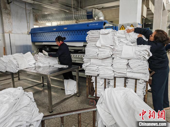 臥具從工業(yè)洗衣機(jī)里撈出后,就進(jìn)入烘干、消毒、熨燙工序,從進(jìn)入烘干機(jī)到再從熨燙機(jī)出來,只需10秒,原本滴水的臥具就變得干燥平展。這對(duì)負(fù)責(zé)折疊、打包的洗滌工手速有著極高的要求。