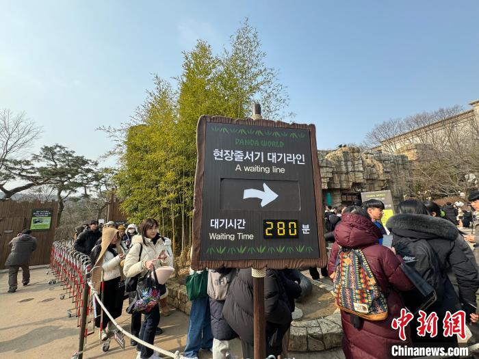 3月3日早上8時(shí)許,中新社記者來(lái)到位于韓國(guó)京畿道龍仁市的三星愛(ài)寶樂(lè)園,此時(shí)距離開(kāi)園時(shí)間10時(shí)尚早,但正門外已排起百米長(zhǎng)隊(duì),大批民眾等待入園與大熊貓“福寶”告別。