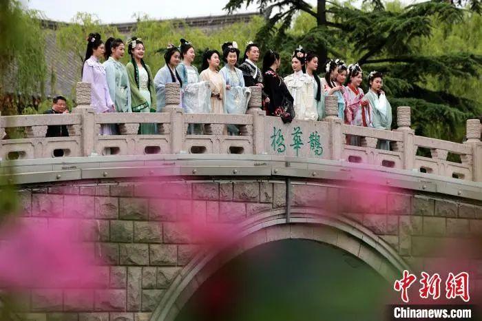 民眾著華服在大明湖鵲華橋拍照。梁犇 攝