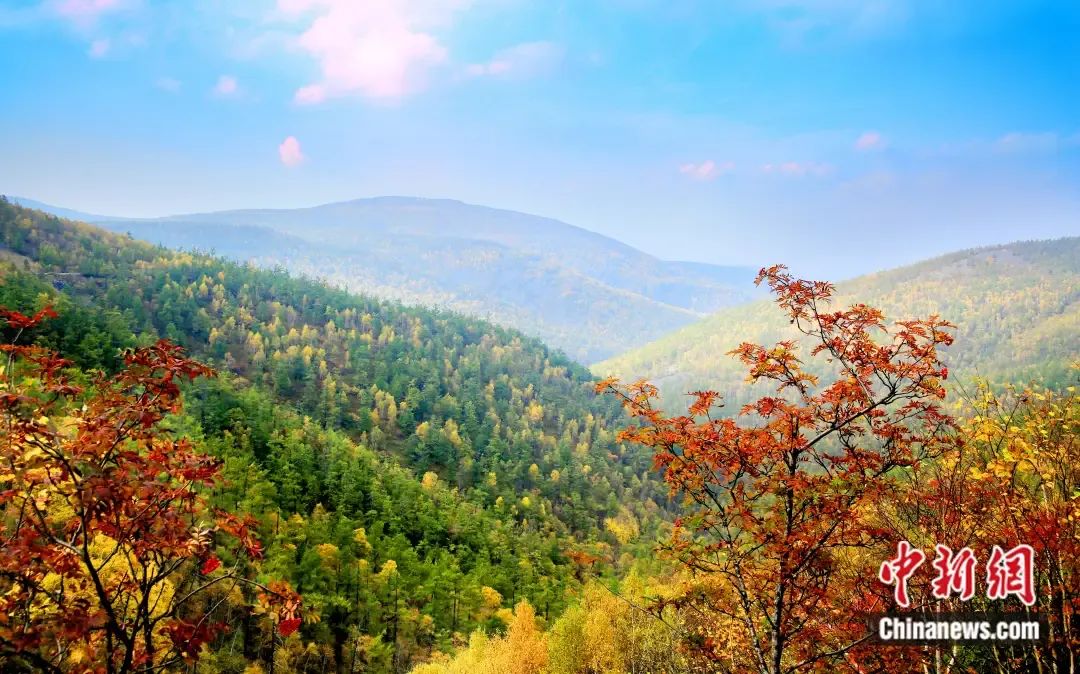 秋天,山嶺間層嶺盡染,似打翻調(diào)色盤。 內(nèi)蒙古森工集團(tuán)供圖