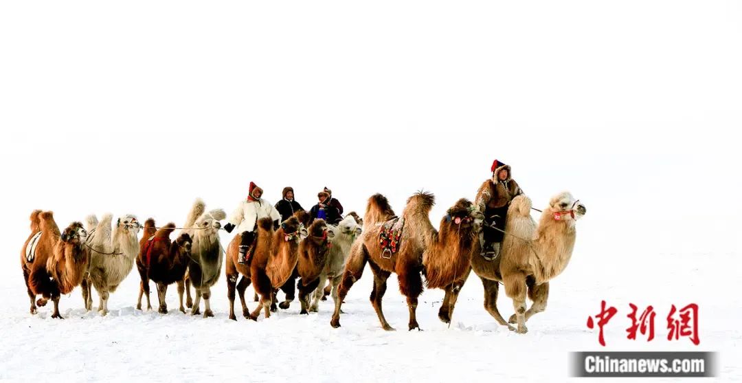 銀裝素裹中,牧民騎著駱駝趕往賽駝現(xiàn)場。 高洪斌 攝