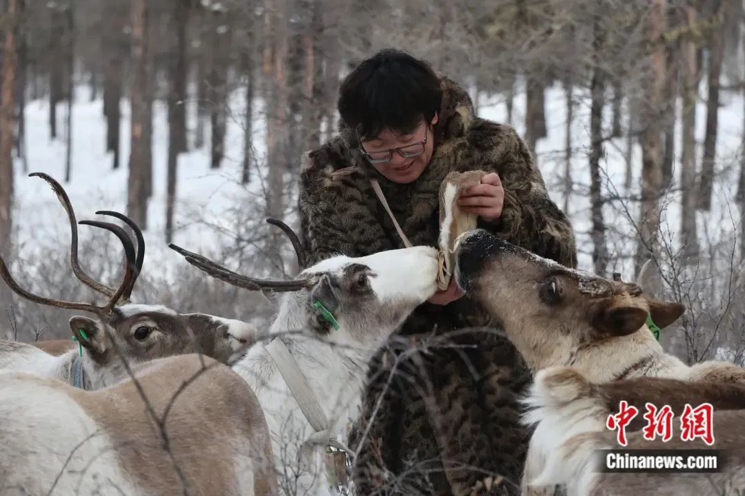 在中國最后一支使鹿部落里,馴鹿貪婪地吃著使鹿鄂溫克人覺樂手里的豆餅。 王鄭胤 攝