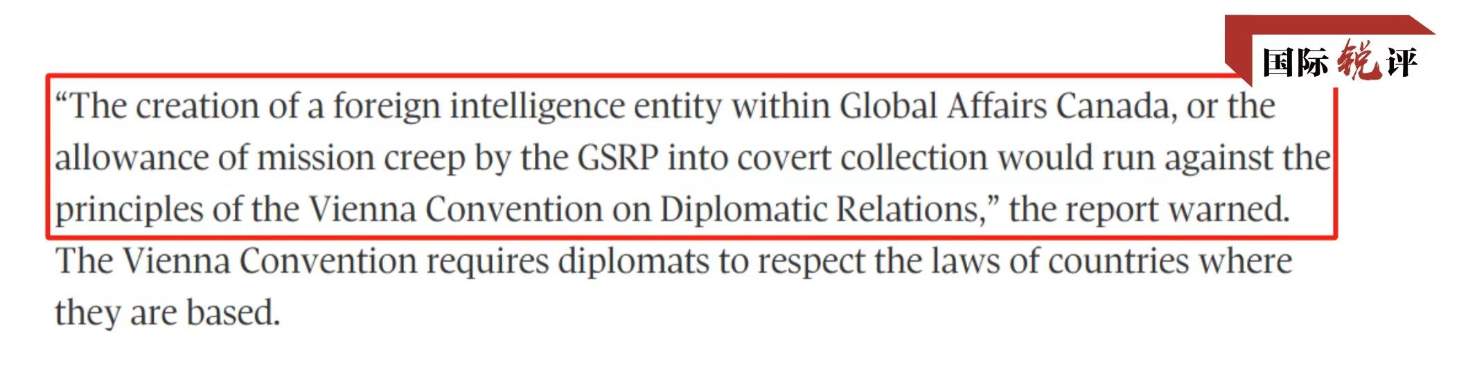 這里不得不提到一個(gè)項(xiàng)目——加拿大外交部“全球安全報(bào)告項(xiàng)目”(GSRP)。它負(fù)責(zé)派遣外交官在熱點(diǎn)地區(qū)收集相關(guān)安全信息,康明凱曾是該項(xiàng)目工作人員。加拿大國(guó)家安全與情報(bào)審查局去年12月發(fā)布的一份審查報(bào)告顯示,GSRP的工作內(nèi)容與加拿大安全情報(bào)局的部分海外任務(wù)有重疊,可能讓本國(guó)官員面臨風(fēng)險(xiǎn),也違反了國(guó)際外交公約。