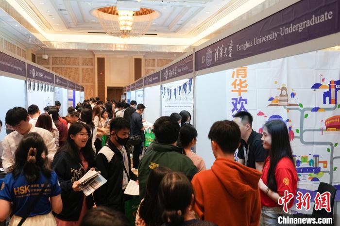 高二學(xué)生伊麗莎白8時(shí)30分就已到達(dá)會(huì)場(chǎng),逐一在高校展臺(tái)前咨詢留學(xué)事宜。每了解完一家,她便會(huì)在手冊(cè)的高校名稱后做個(gè)標(biāo)記。
