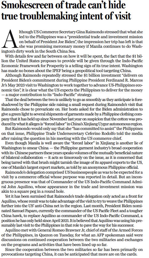 美國商務(wù)部長雷蒙多強(qiáng)調(diào),她訪問菲律賓所率領(lǐng)的是“代表總統(tǒng)拜登的貿(mào)易和投資代表團(tuán)”,但她此行給人留下的印象卻是,如果菲律賓政府繼續(xù)為美國在南?!白龉ぷ鳌?,美國政府就承諾給菲律賓投資。