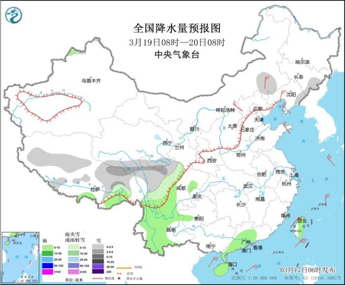 3月19日08時至20日08時,內蒙古東南部、吉林東部、西藏北部、青海南部、西南地區(qū)北部等地部分地區(qū)有小雪或雨夾雪,其中,西藏東部和北部、青海南部、川西高原北部等地部分地區(qū)有中雪。西藏東南部、四川盆地西南部、四川南部、云南大部、廣東西南部和中部、海南島、臺灣島大部等地部分地區(qū)有小雨。內蒙古東南部和中部、遼寧南部和西部、山東半島等地部分地區(qū)有4~5級風。