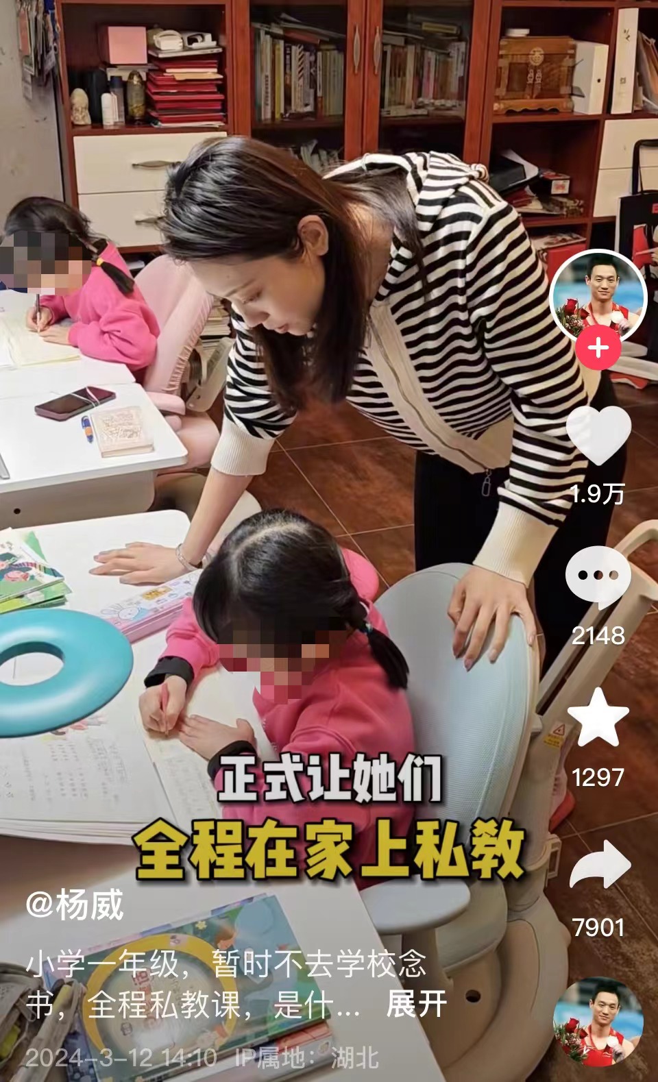 近日,體操奧運(yùn)冠軍楊威在社交平臺(tái)發(fā)布視頻稱(chēng),由于去年兩個(gè)女兒連生好幾場(chǎng)病后,他跟妻子楊云做了個(gè)大膽嘗試,讓上一年級(jí)的兩個(gè)女兒暫時(shí)不去學(xué)校念書(shū),全程在家上私教。