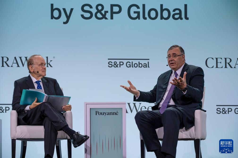 3月18日,法國(guó)道達(dá)爾能源首席執(zhí)行官帕特里克·普亞納(右)在美國(guó)休斯敦舉行的能源界高端會(huì)議“劍橋能源周”上分享觀點(diǎn)。新華社發(fā)(陳晨攝)
