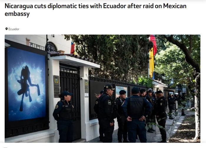 據(jù)報道,公告稱,尼方堅決反對并譴責(zé)厄政府“公然違反國際法的行為”。厄安全部隊本應(yīng)履行保護(hù)厄公民秩序、安全及生命的職責(zé),卻在厄首都基多進(jìn)行了“不正常且令人斥責(zé)”的行動。
