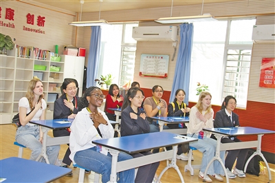 在石家莊外國語學(xué)校,中美兩國學(xué)生一起學(xué)習(xí)中國古詩。