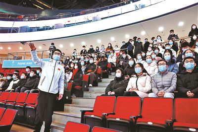 在現(xiàn)場,陳大鵬通過“由內及外”“由下至上”的方式,將場館的競賽層、觀眾層、包廂層等流線以及各點位進行了詳細的講解,并以“你需要知道的25件事”為主題,為志愿者們講解了作為場館工作人員必須遵守的各項規(guī)章制度?!斑@25件事包括志愿者在場館工作的方方面面,既有場館日常管理、防疫規(guī)定,又有志愿者工作期間個人生活及行為規(guī)范、工作紀律和文明禮儀等?!标惔簌i說。