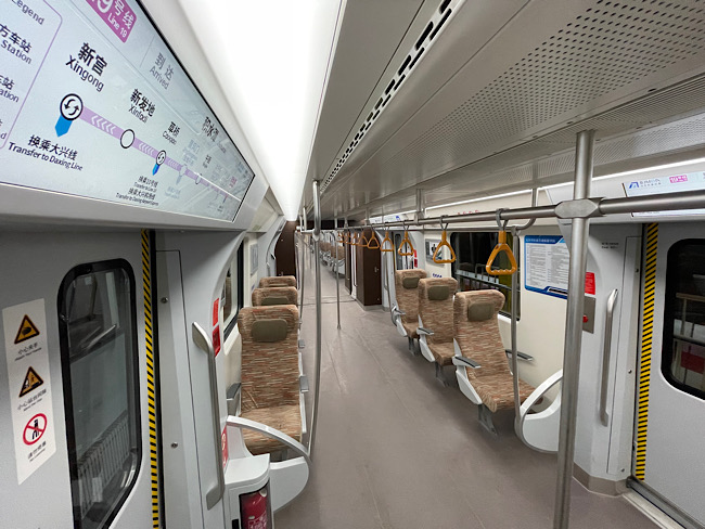 走進車廂,記者注意到,車內沒有用來隔絕駕駛室與客室的間壁門,而是采用開放式駕駛室,乘客可在保證安全的情況下更直觀地感受駕駛員的視角。此外,考慮到接駁大興機場線大件行李旅客的需求,“虎鯨號”列車設計2節(jié)“特別”車廂,車廂內設置左右兩邊單列單座的高鐵同款座椅,乘客可將大件行李放在座位側邊,避免車廂內擁擠。