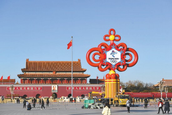 昨天,天安門(mén)廣場(chǎng)又添新景。一個(gè)鑲嵌有2022冬奧會(huì)會(huì)徽的巨型中國(guó)結(jié)正在安裝。中國(guó)結(jié)整體呈紅色,中心鑲嵌一片藍(lán)白相間的雪花,雪花正中是2022冬奧會(huì)會(huì)徽,為迎接春節(jié)和冬奧營(yíng)造喜慶氛圍。 本報(bào)記者 鄧偉攝
