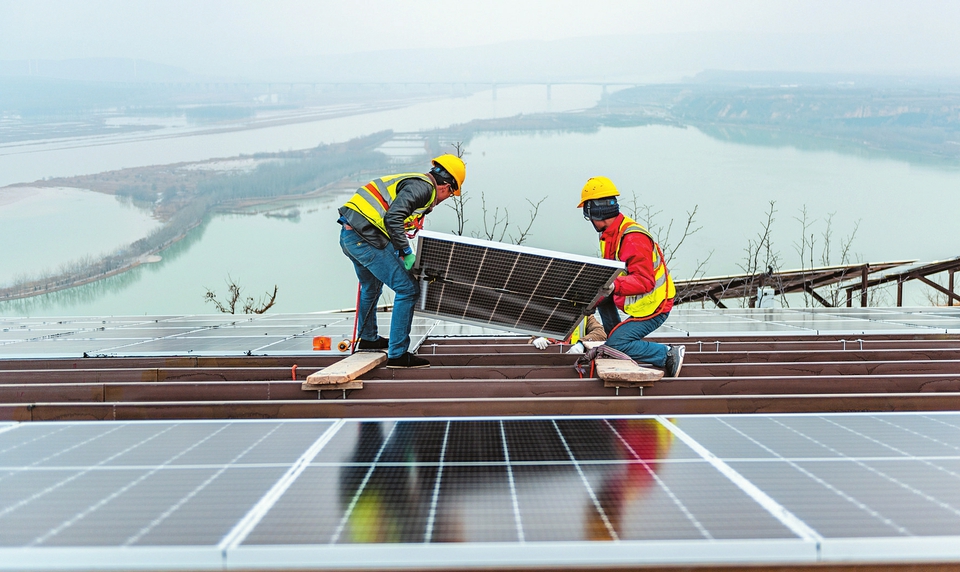 1月7日,施工人員在高空中安裝光伏板。芮城縣莊上村在“2MW光儲直柔直流微網(wǎng)”項(xiàng)目建設(shè)中,嚴(yán)格按照安全施工要求,對高空作業(yè)人員使用的安全帶、頭盔、手套等設(shè)備,作業(yè)之前逐個(gè)檢查,并對高空作業(yè)人員進(jìn)行安全常識教育,做到安全生產(chǎn)萬無一失。(薛俊攝)