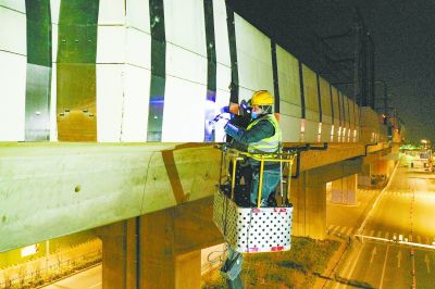 寧和城際高架橋護(hù)欄板加固工程施工現(xiàn)場(chǎng)。 南報(bào)融媒體記者 段仁虎攝