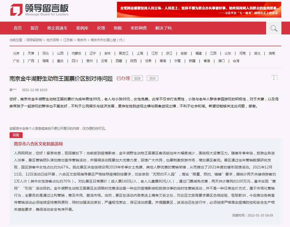 2021年12月8日,網(wǎng)友在人民網(wǎng)“領導留言板”向南京市市長留言稱,南京市金牛湖野生動物王國的票價為成年男性99元,老人與小孩69元,女性免費。此舉不僅打擊男性、小孩與老年人參園游玩的積極性,而且對于夫妻以及母親帶孩子一起游玩的群體也不甚友好,不利于公民娛樂與經(jīng)濟發(fā)展,另外更存在性別歧視與弱者歧視之嫌,不利于社會和諧。