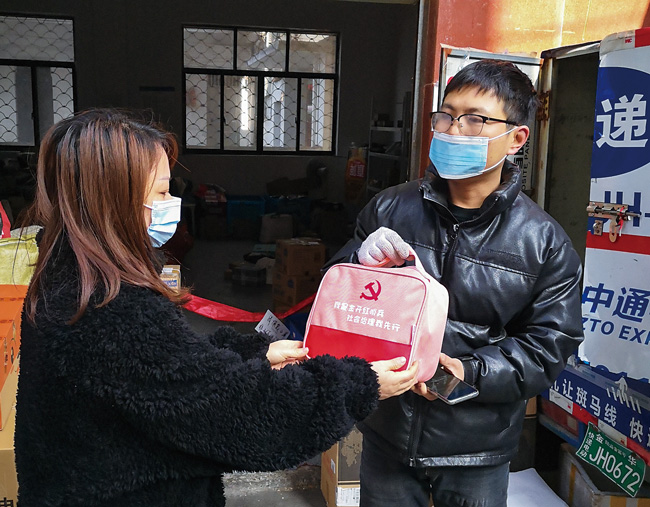 1月12日,金華開(kāi)發(fā)區(qū)江南街道金錢(qián)寺社區(qū)給快遞小哥贈(zèng)送裝有口罩、酒精、消毒液等物資的“防疫禮包”,讓快遞小哥做好自身防護(hù)。(時(shí)寬兵)