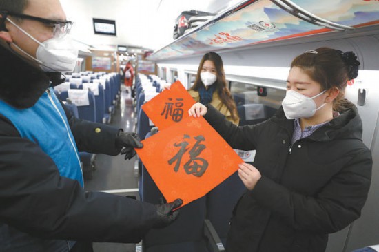 昨天5時34分,北京地區(qū)首趟春運高鐵G6737次列車發(fā)車,列車員將精心準備的福字送給旅客。本報記者 安旭東攝