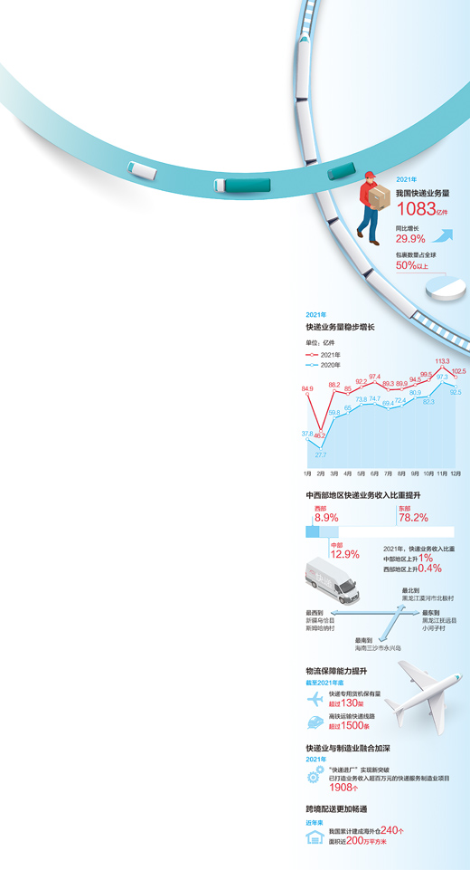 記者從國(guó)家郵政局獲悉,2021年全年,我國(guó)快遞業(yè)務(wù)量達(dá)1083億件,同比增長(zhǎng)29.9%,包裹數(shù)量占全球一半以上。