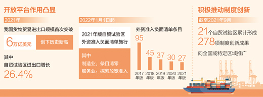 日前,我國2021年外貿(mào)成績單發(fā)布,貨物貿(mào)易進(jìn)出口規(guī)模首次突破6萬億美元。其中,自由貿(mào)易試驗區(qū)進(jìn)出口增長26.4%,呈現(xiàn)蓬勃發(fā)展態(tài)勢。