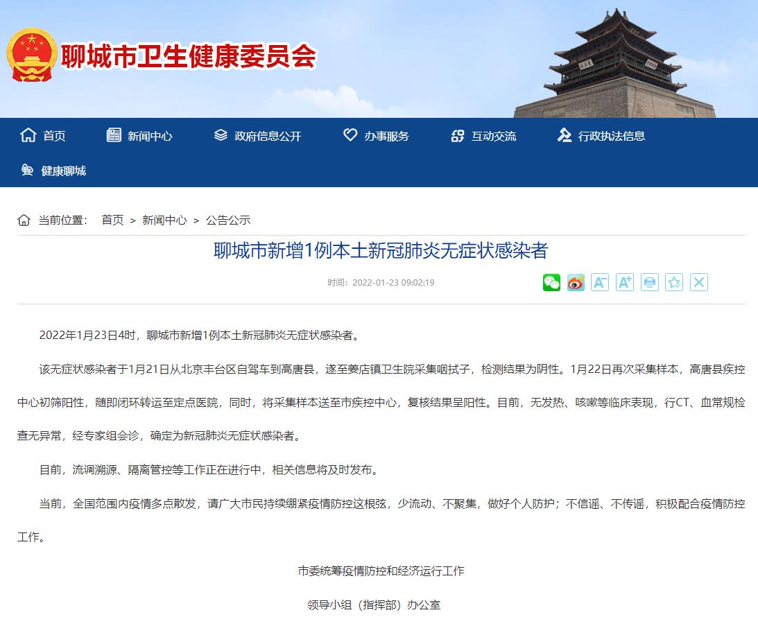 人民網(wǎng)聊城1月23日電 (劉穎婕)據(jù)聊城市衛(wèi)健委通報(bào),2022年1月23日4時(shí),聊城市新增1例本土新冠肺炎無癥狀感染者。