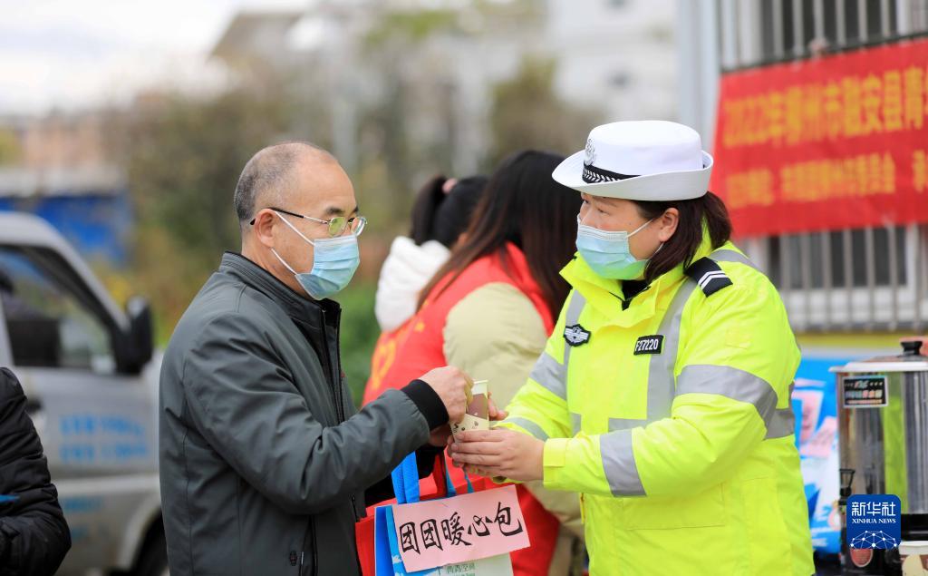 1月17日,在209國(guó)道廣西柳州市融安縣段“春運(yùn)愛(ài)心驛站”,交通輔警為司乘人員送姜糖茶。新華社發(fā)(譚克興攝)