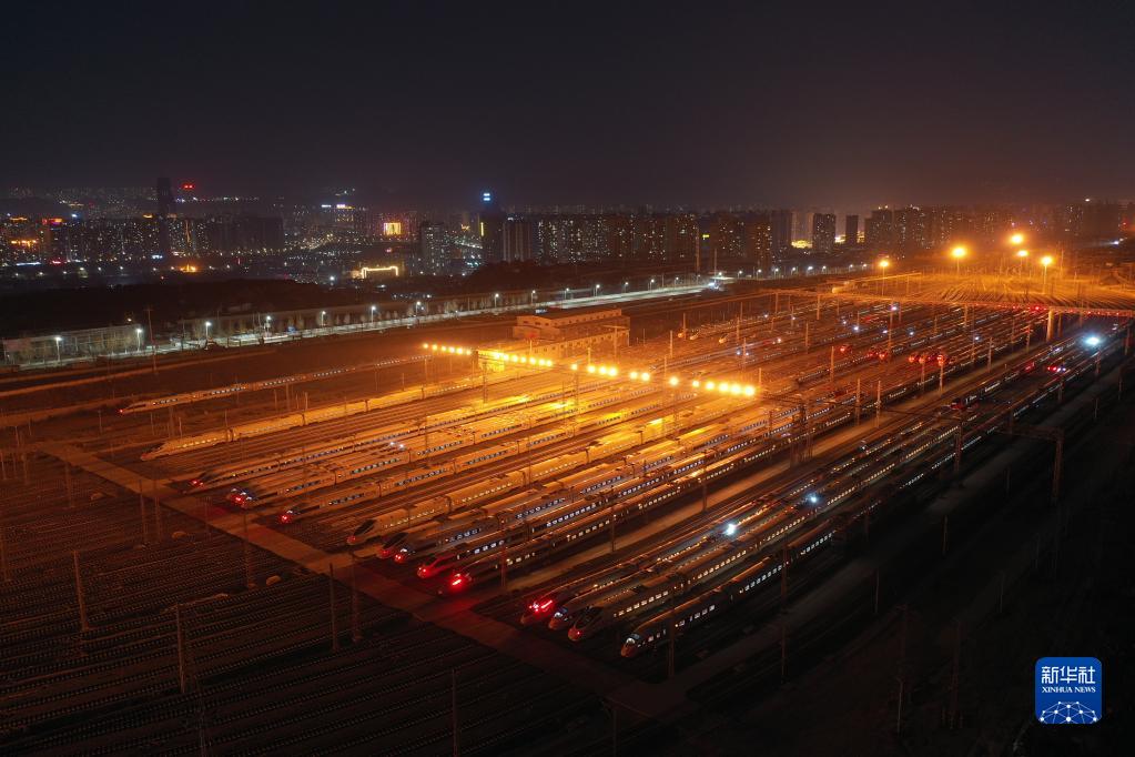 1月16日晚,動(dòng)車(chē)組列車(chē)??吭谥袊?guó)鐵路蘭州局集團(tuán)有限公司蘭州車(chē)輛段蘭州西動(dòng)車(chē)運(yùn)用所整備場(chǎng)上,為1月17日開(kāi)始的2022年春運(yùn)做好準(zhǔn)備(無(wú)人機(jī)照片)。新華社記者 杜哲宇 攝
