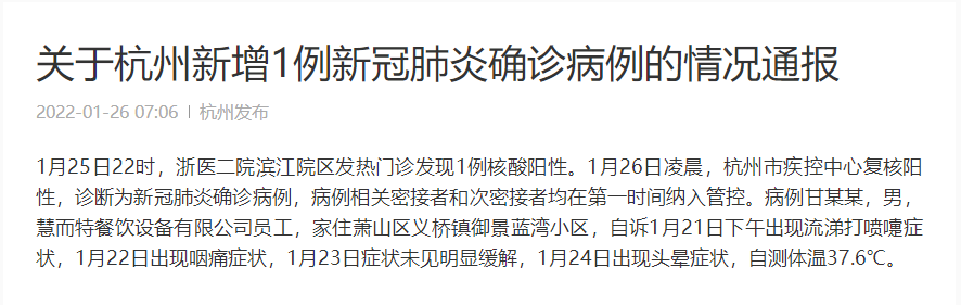 1月25日22時(shí),浙醫(yī)二院濱江院區(qū)發(fā)熱門(mén)診發(fā)現(xiàn)1例核酸陽(yáng)性。1月26日凌晨,杭州市疾控中心復(fù)核陽(yáng)性,診斷為新冠肺炎確診病例,病例相關(guān)密接者和次密接者均在第一時(shí)間納入管控。病例甘某某,男,慧而特餐飲設(shè)備有限公司員工,家住蕭山區(qū)義橋鎮(zhèn)御景藍(lán)灣小區(qū),自訴1月21日下午出現(xiàn)流涕打噴嚏癥狀,1月22日出現(xiàn)咽痛癥狀,1月23日癥狀未見(jiàn)明顯緩解,1月24日出現(xiàn)頭暈癥狀,自測(cè)體溫37.6℃。