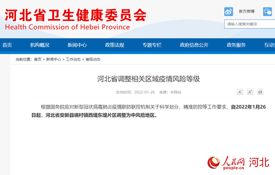 人民網(wǎng)石家莊1月26日電 據(jù)河北省衛(wèi)健委官方網(wǎng)站消息,根據(jù)國(guó)務(wù)院應(yīng)對(duì)新型冠狀病毒肺炎疫情聯(lián)防聯(lián)控機(jī)制關(guān)于科學(xué)劃分、精準(zhǔn)防控等工作要求,自2022年1月26日起,河北省安新縣端村鎮(zhèn)西堤?hào)|堤片區(qū)調(diào)整為中風(fēng)險(xiǎn)地區(qū)。