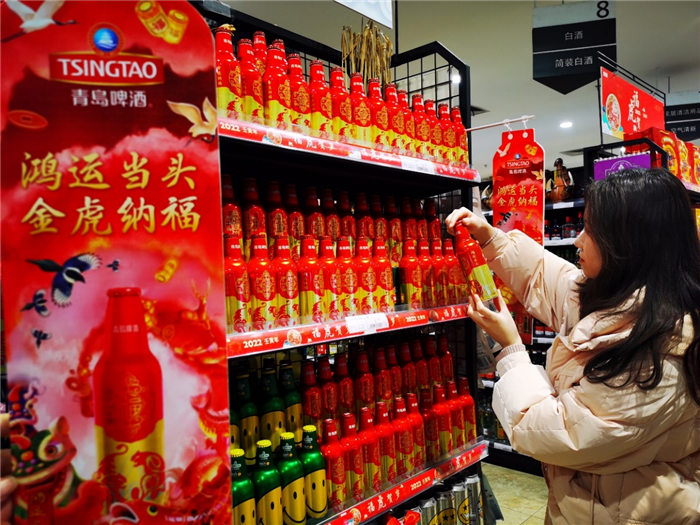 年味不僅是物質(zhì)上的豐富,也有文化上的追求。“過(guò)年就買(mǎi)‘鴻運(yùn)當(dāng)頭’,圖個(gè)好彩頭。”消費(fèi)者王先生每年過(guò)年都會(huì)“鴻運(yùn)當(dāng)頭,先囤一波”,作為年夜飯的“必選項(xiàng)”?!澳暌癸埍仨毤t紅火火,不管是名字還是包裝,鴻運(yùn)當(dāng)頭就是喜慶,而且酒也好喝,每年還出不同的生肖版,我都收藏著著呢?!痹S多消費(fèi)者表示,這款青島啤酒成為春節(jié)當(dāng)之無(wú)愧的“鴻運(yùn)”年貨,走親訪友拎上一提,年味就出來(lái)了。