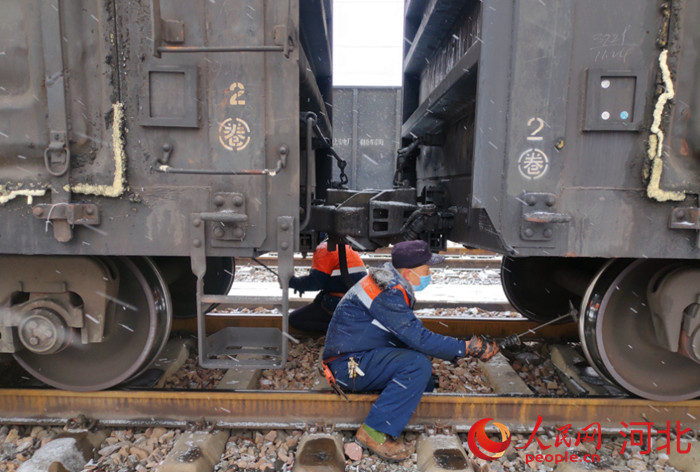 雪天,貨車(chē)檢車(chē)員正在“叮叮當(dāng)當(dāng)”認(rèn)真檢查車(chē)輪。 馮世新攝