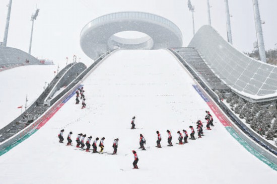 昨天,被稱(chēng)為“雪如意”的國(guó)家跳臺(tái)滑雪中心清雪整裝迎訓(xùn)練。新華社發(fā)