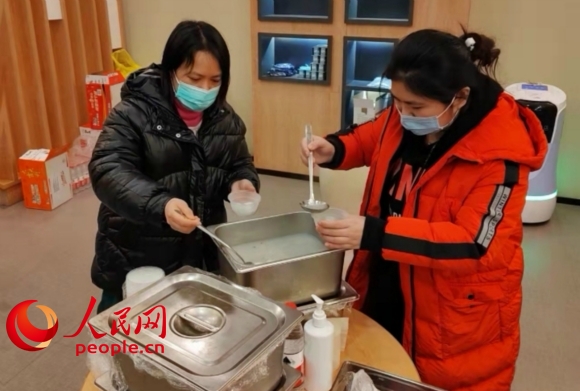 元宵節(jié)當(dāng)天,蘇州市吳中區(qū)郭巷街道湖景花園社區(qū)為隔離人員送上熱氣騰騰的湯圓。沈君攝