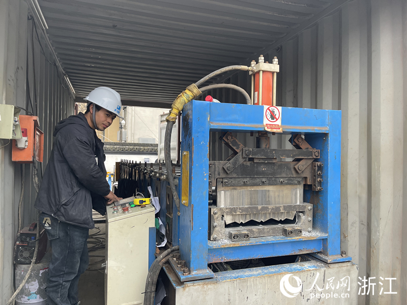 令狐偉偉正在操作機(jī)器壓制金屬屋面板。人民網(wǎng) 王蕭蕭攝