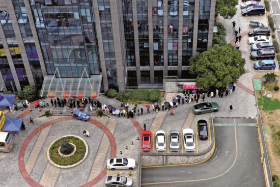 2月17日,在嘉興秀洲區(qū)新城街道中禾廣場,居民們排隊(duì)有序進(jìn)行核酸檢測。
