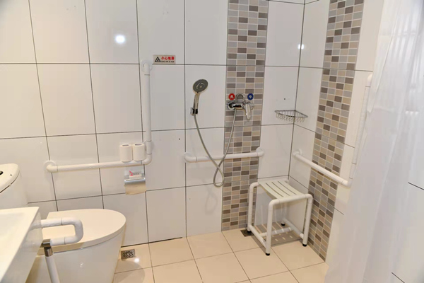 酒店前臺設(shè)置了低位服務(wù)臺,坐著就可以辦理入住登記等手續(xù)。進(jìn)入電梯后,電梯按鈕上附有盲文,方便視力障礙人士使用;鏡面、扶手、語音播報一應(yīng)俱全。來到客房部,走廊平整開闊,鋪設(shè)了防滑地膠,客房的房門也進(jìn)行了拓寬。進(jìn)入客房內(nèi),低位開關(guān)、無障礙寫字桌、開放式衣柜等,讓人感覺溫暖、舒適。衛(wèi)生間里配備了各類無障礙設(shè)施,淋浴區(qū)一側(cè)的墻壁上裝有無障礙扶手,并配備了無障礙淋浴椅和寬大的浴室鏡等。低位洗手盆旁邊,是低位置物架,上面放著擦手巾。